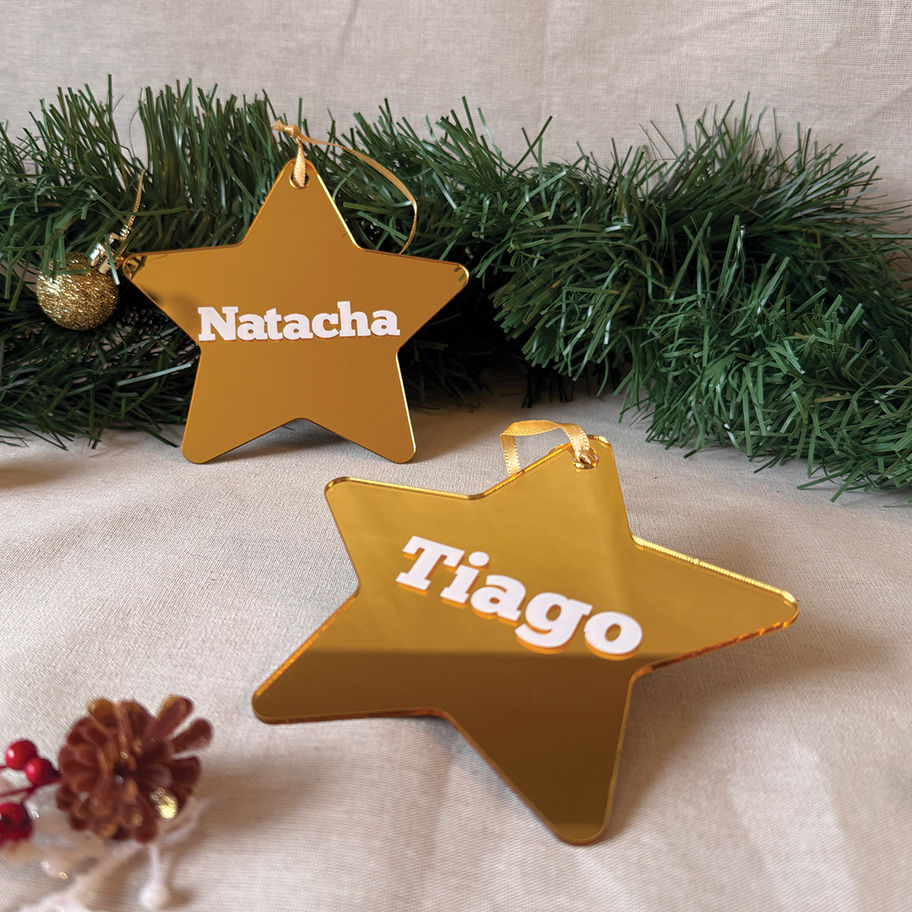 Enfeite para árvore de Natal em formato de estrela, personalizável com um nome ou palavra. Um detalhe especial que adiciona charme e significado à decoração natalina.